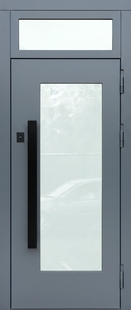 Металлическая термодверь с большим стеклом, фрамугой, длинной ручкой и серыми плитами МДФ RAL 9002 КД-1309