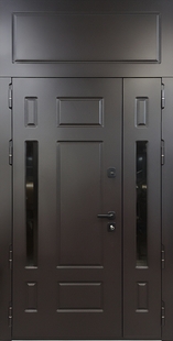Полуторная входная термодверь с верхней вставкой, узкими стеклами и черными панелями МДФ RAL сочетает элегантность и инженерную надёжность. МДФ-панели выполняются с точной фрезеровкой, подчёркивающей геометрию и стиль модели. Подходят для оформления в стиле минимализм, лофт или модерн. Оформление подойдет для фасадов с декоративными элементами.