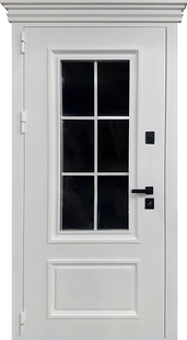 Остекленная уличная термодверь с карнизом, металлобагетом и белым полимерным покрытием КД-1292